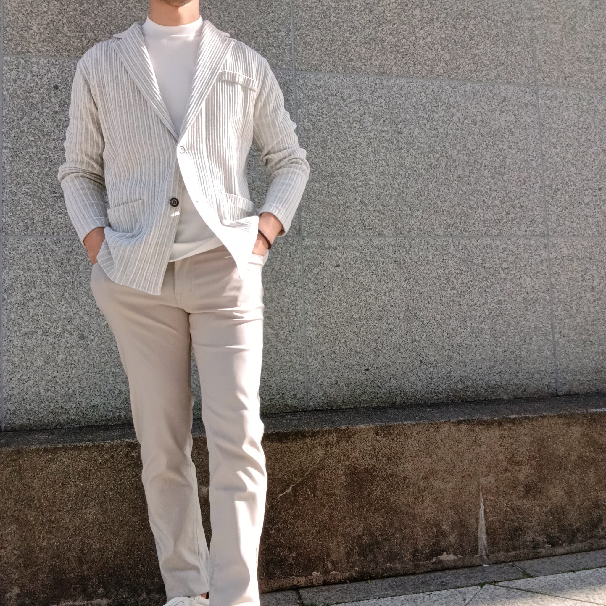 白を効かせたストライプが縦のラインを引き立て、端正な印象を演出。