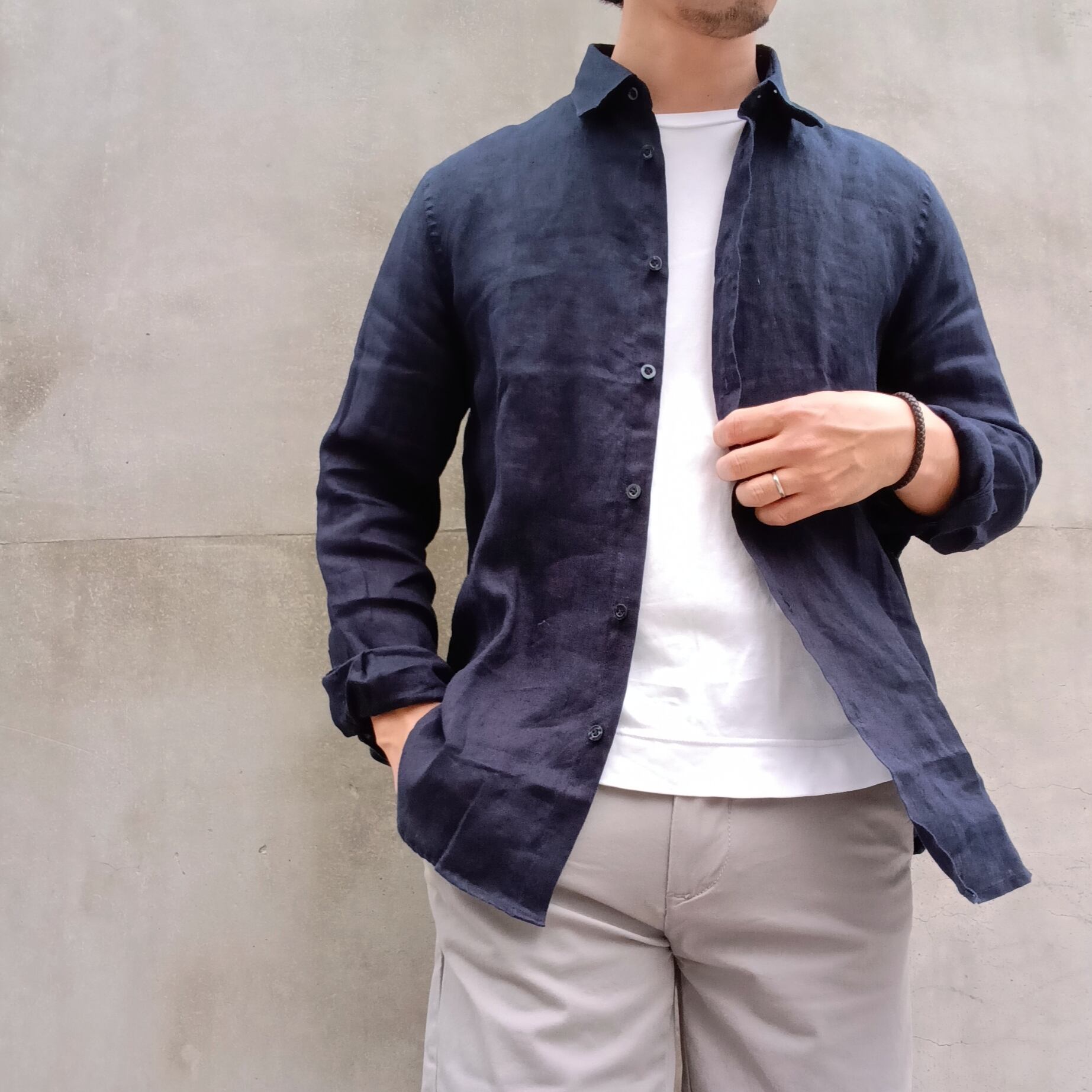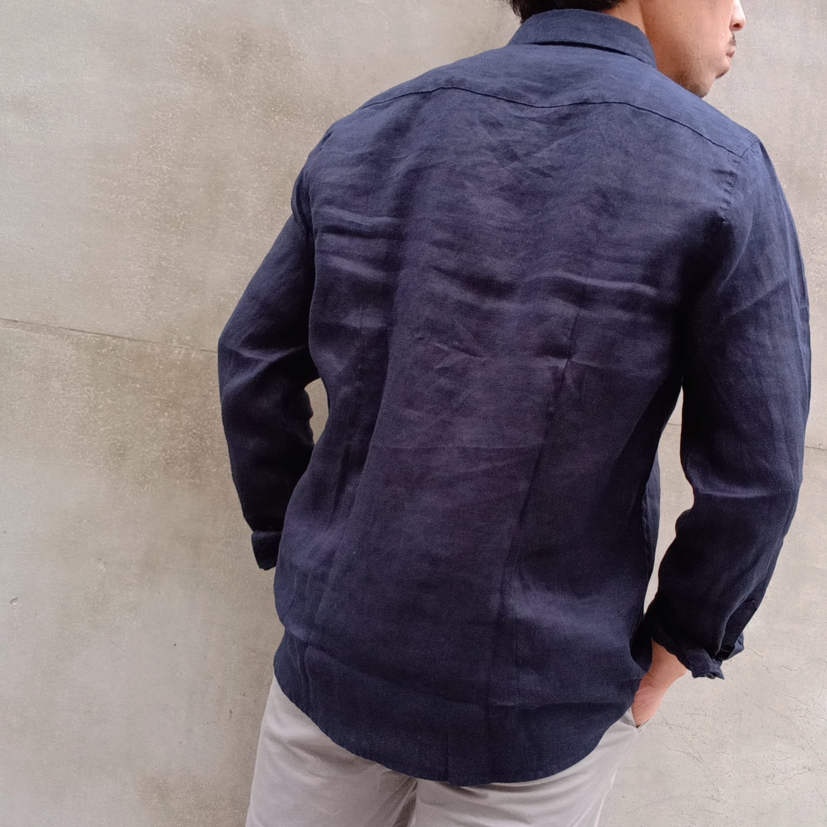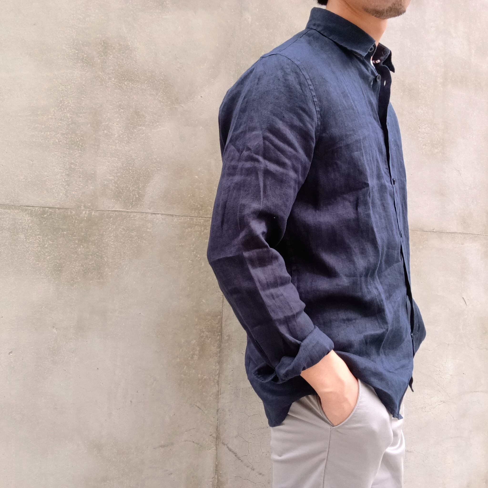 リネン100%、レギュラーカラーのロングスリーブシャツ。ジャケットやショーツなどのアイテムとも相性のよい夏のシーズンに欠かせないアイテム。リネンならではの透け感やシワ感を楽しむ、大人のおしゃれコーデにオススメです。シルエットは程よくウエスト部分がシェイプされてとてもスタイリッシュ。