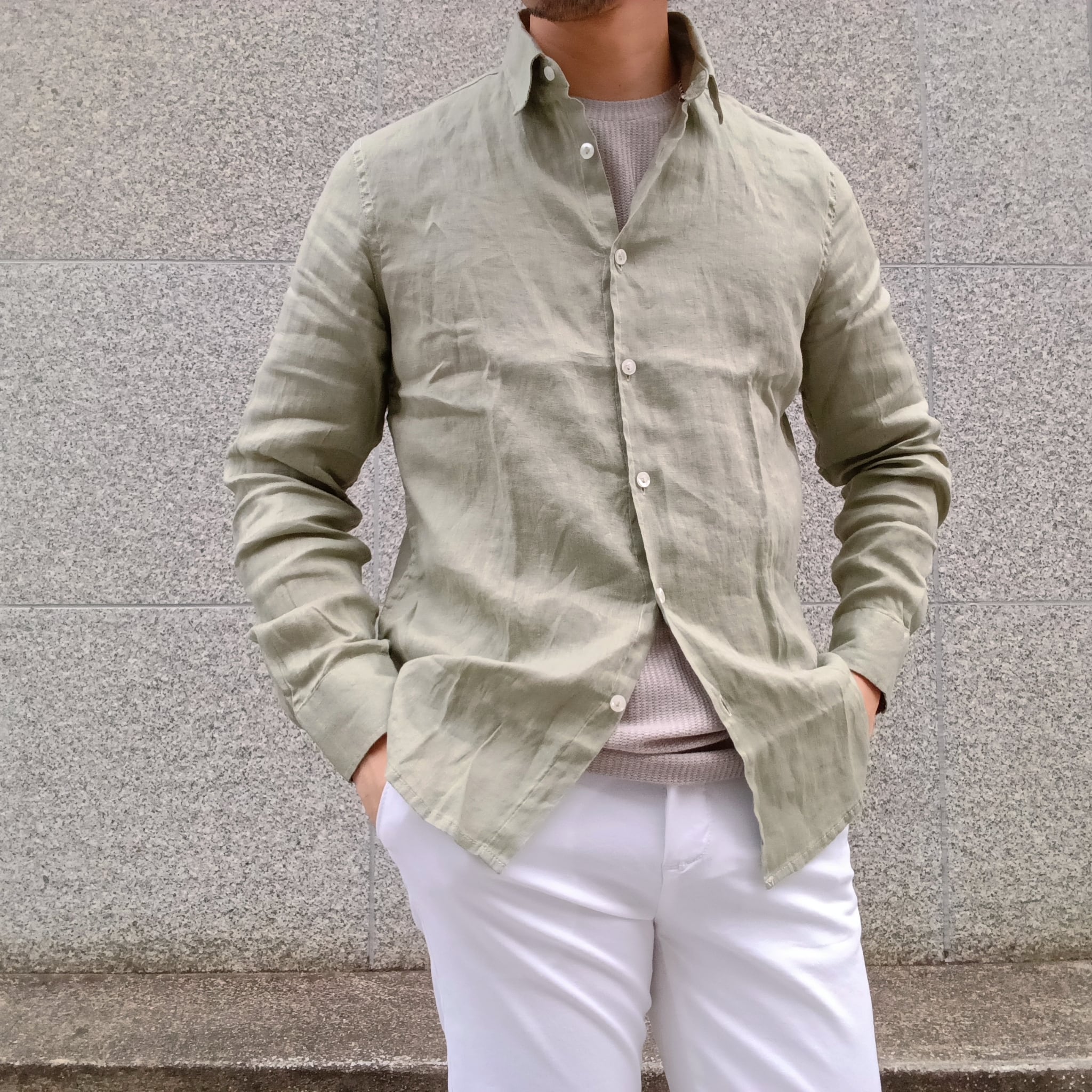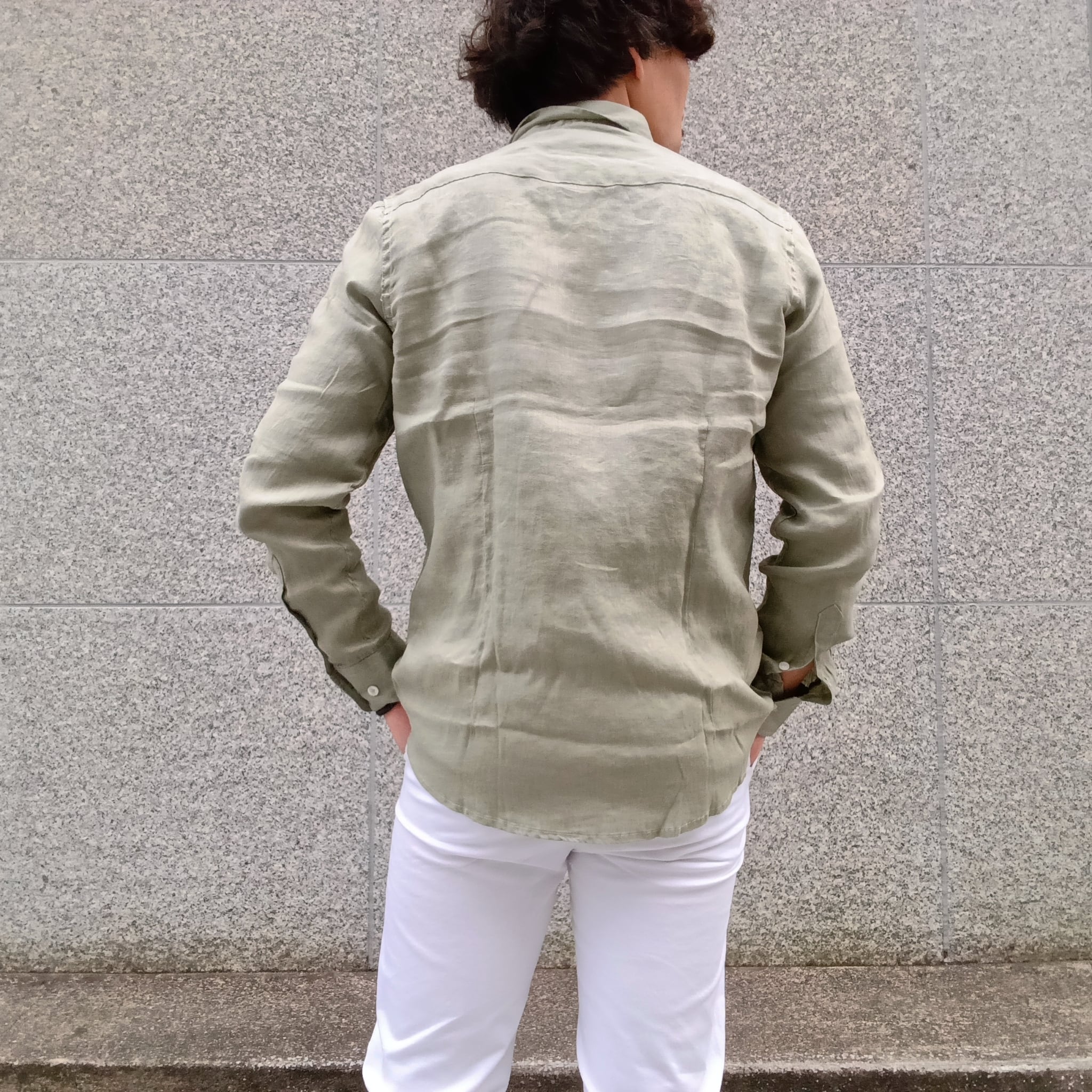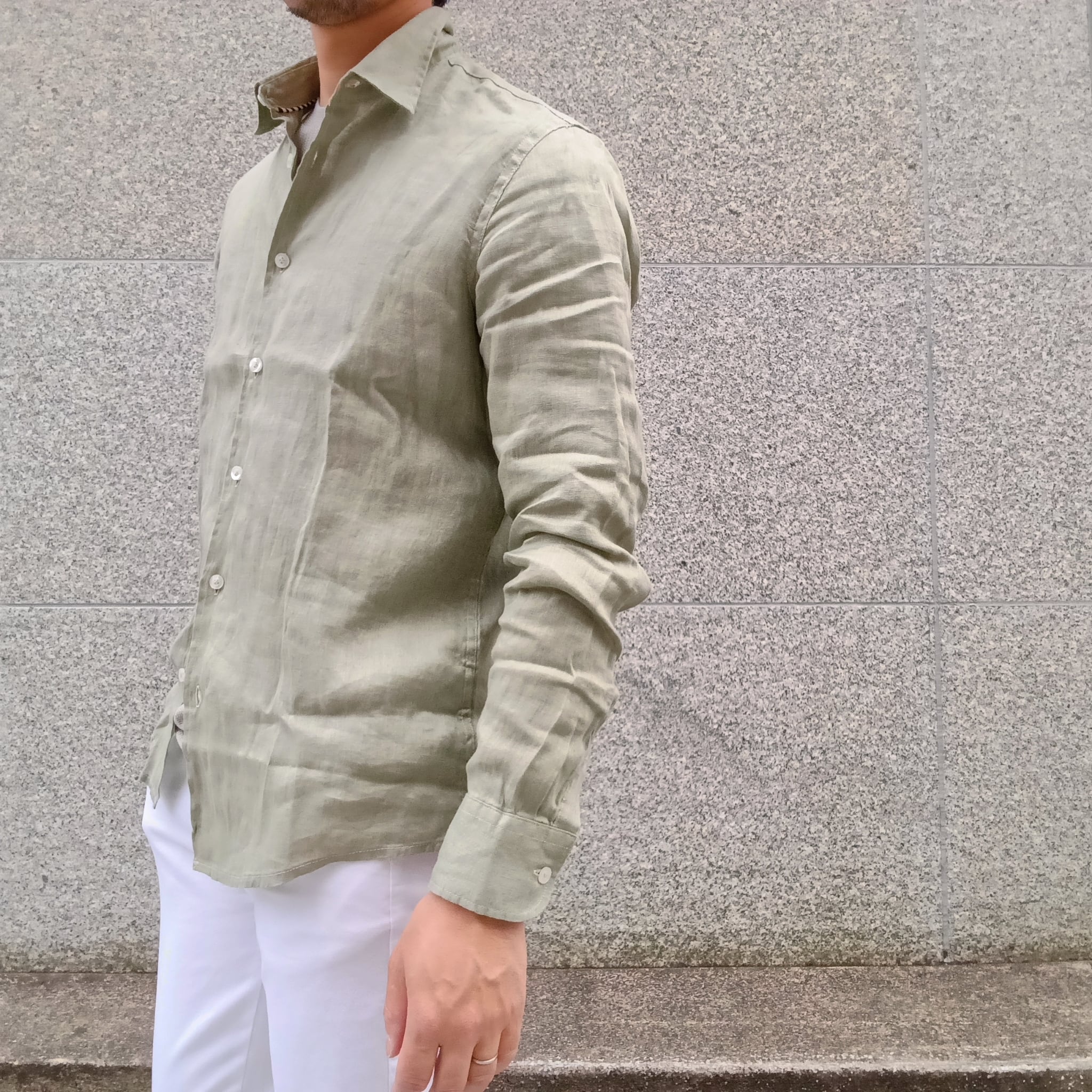 リネン100%、レギュラーカラーのロングスリーブシャツ。ジャケットやショーツなどのアイテムとも相性のよい夏のシーズンに欠かせないアイテム。リネンならではの透け感やシワ感を楽しむ、大人のおしゃれコーデにオススメです。シルエットは程よくウエスト部分がシェイプされてとてもスタイリッシュ。