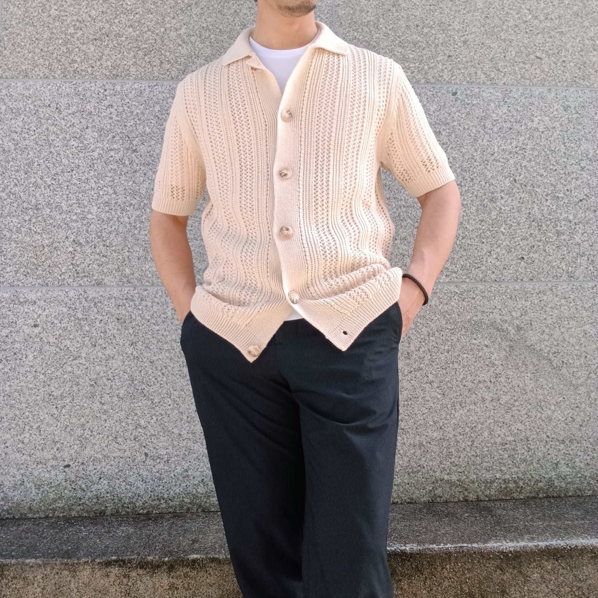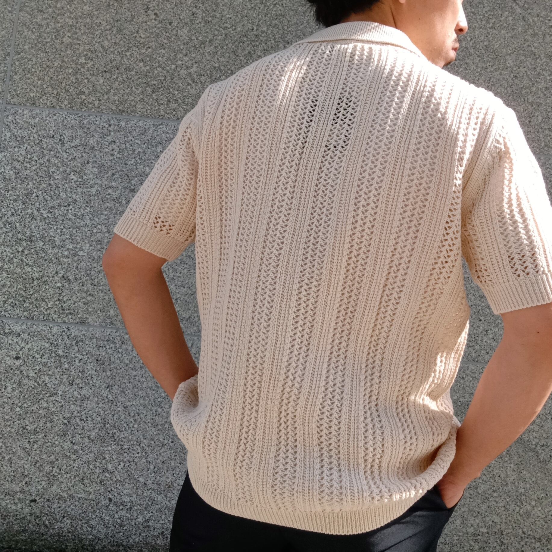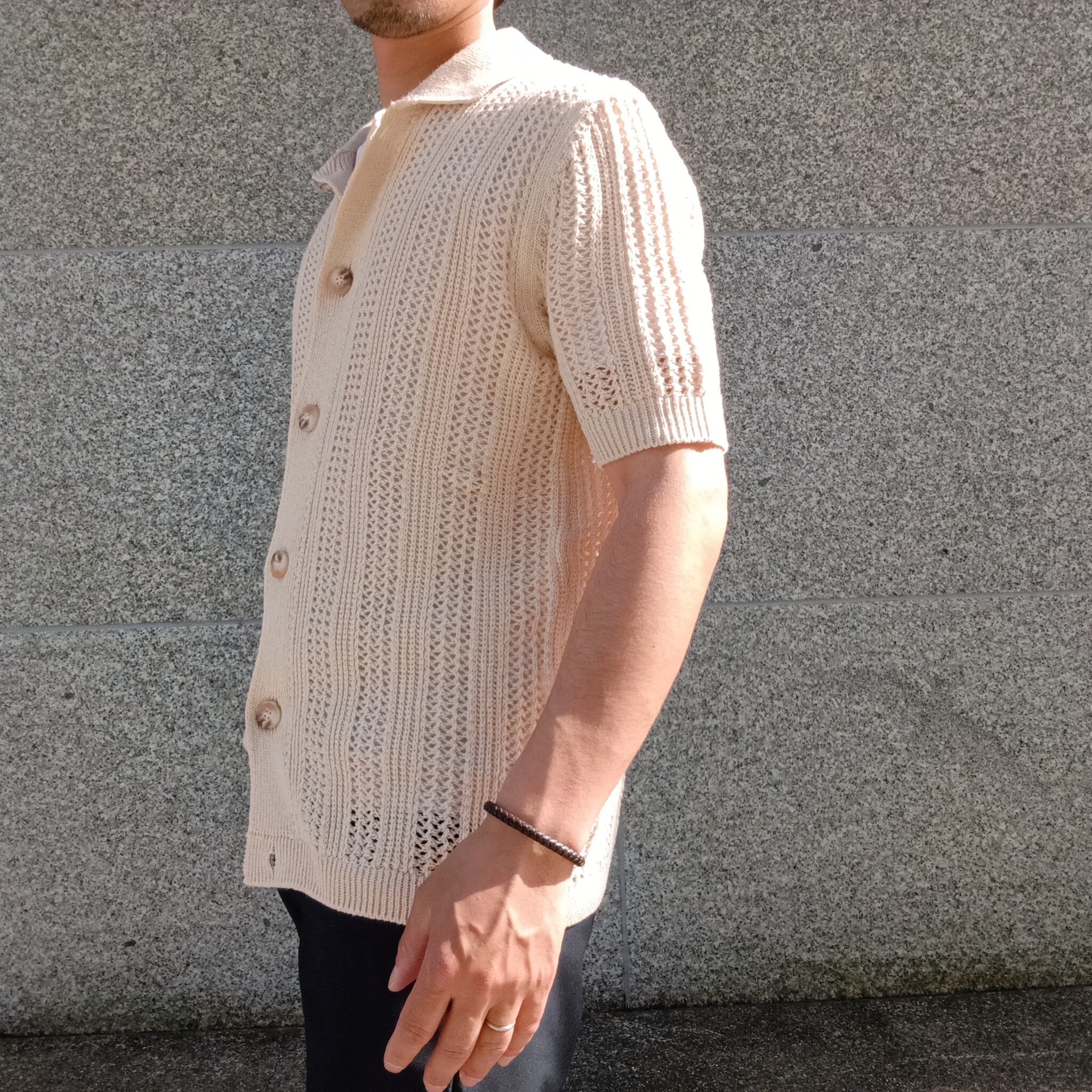 涼し気なメッシュ編みの半袖ニットシャツです。Tシャツ頼みの夏コーデに、さっと羽織るだけでこなれた印象に。シャツとしても羽織としても使えるシャツカーデが、いつもと違う雰囲気と“手抜き感のないスタイル”をつくります。風を通して涼しく、見た目にも爽やか。Tシャツに重ねるだけで、ほどよく力の抜けた夏らしいスタイリングが完成します。