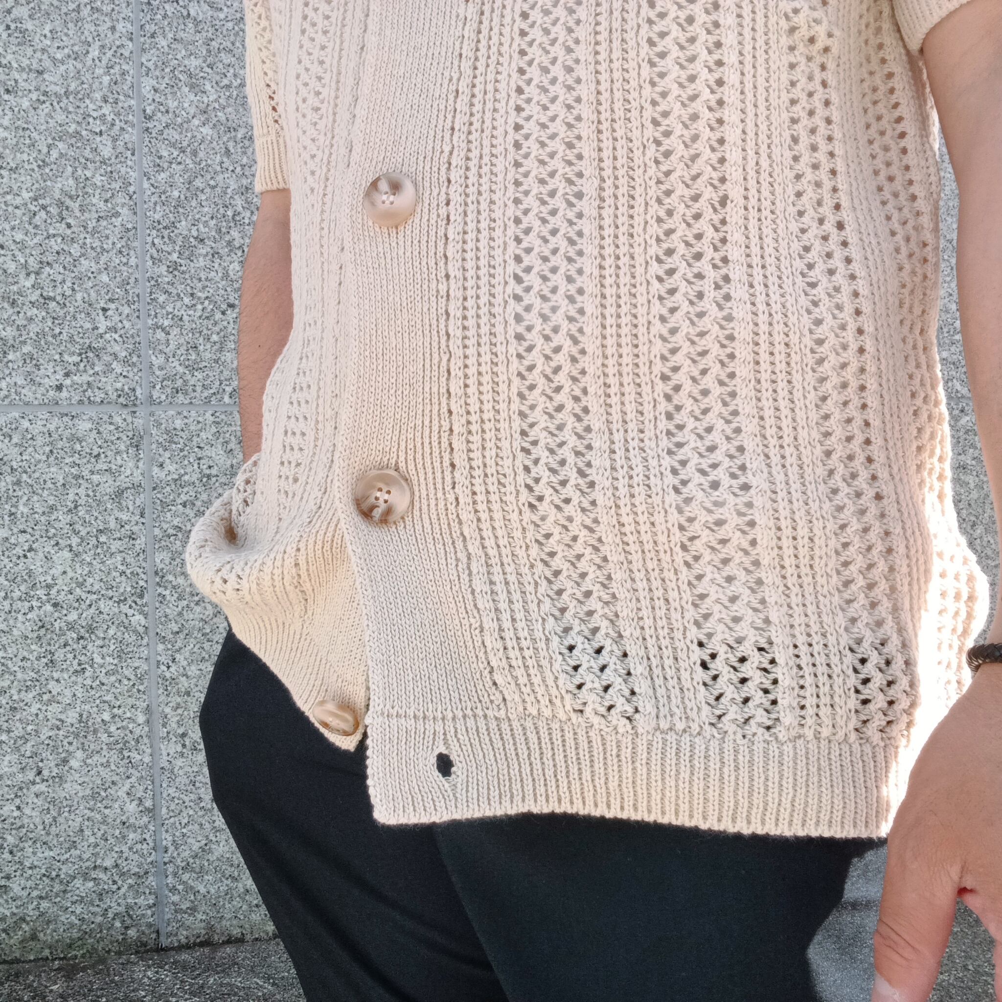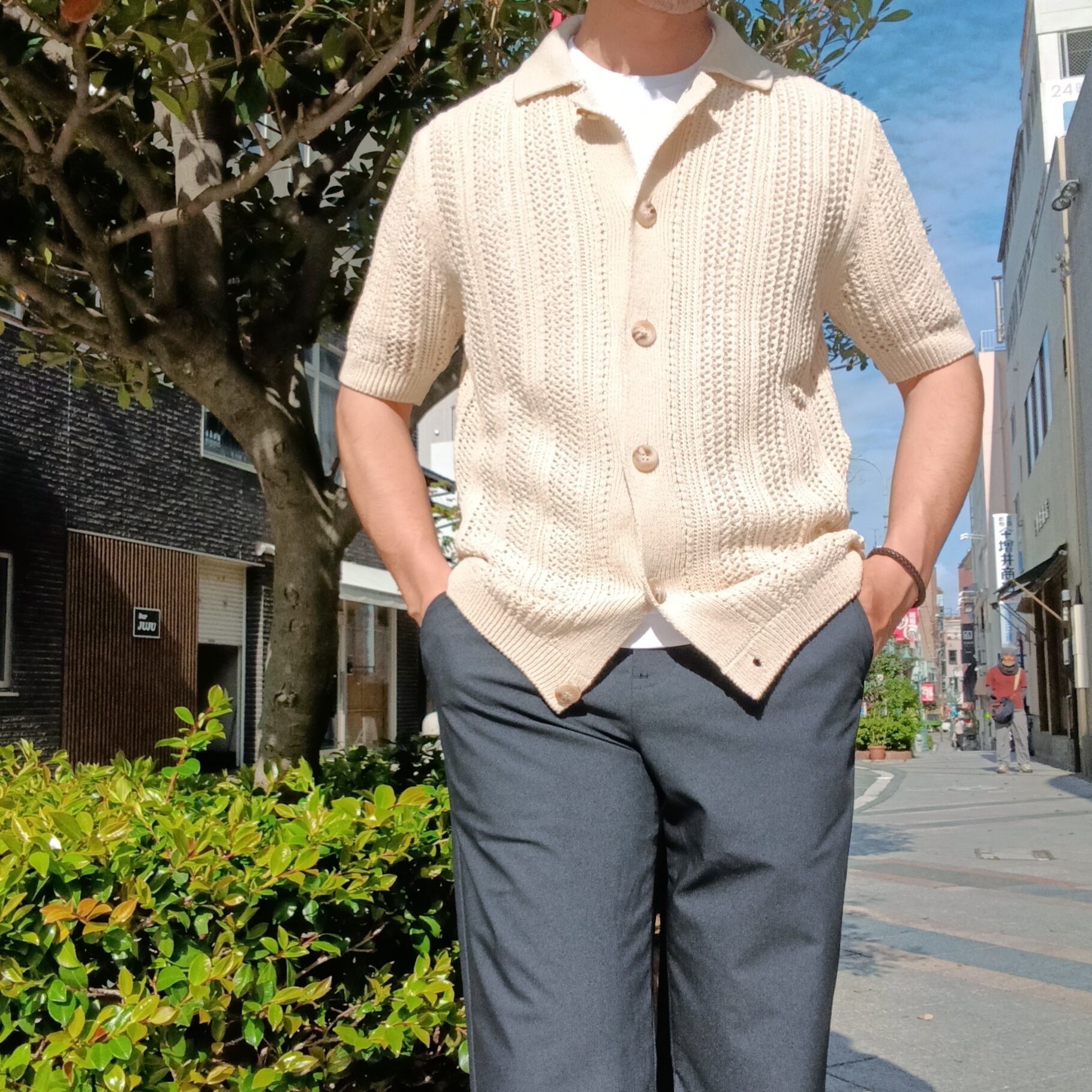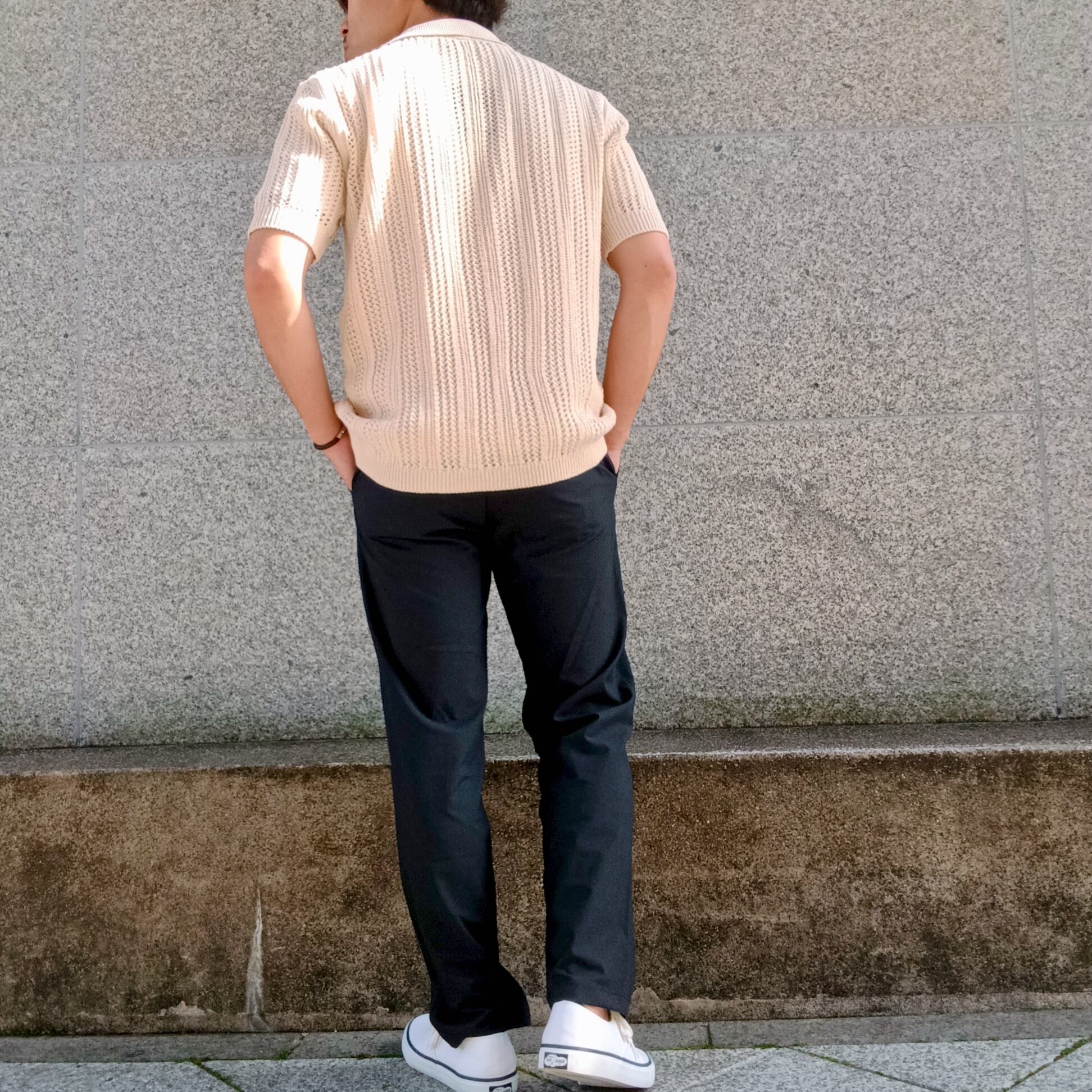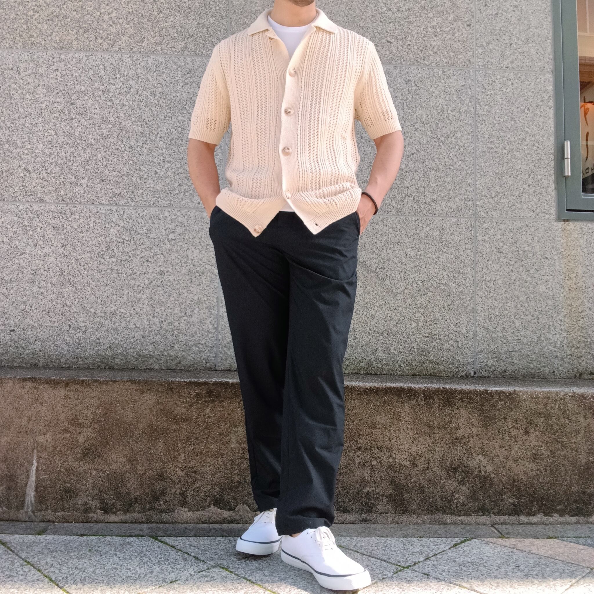 涼し気なメッシュ編みの半袖ニットシャツです。Tシャツ頼みの夏コーデに、さっと羽織るだけでこなれた印象に。シャツとしても羽織としても使えるシャツカーデが、いつもと違う雰囲気と“手抜き感のないスタイル”をつくります。風を通して涼しく、見た目にも爽やか。Tシャツに重ねるだけで、ほどよく力の抜けた夏らしいスタイリングが完成します。