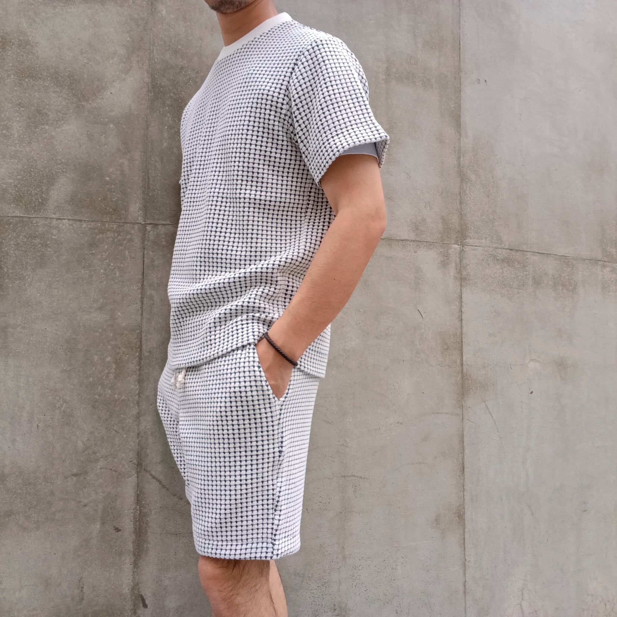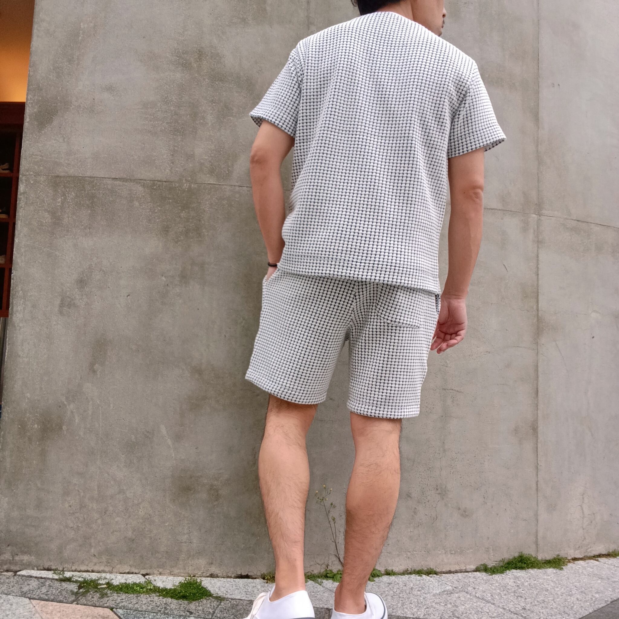 ・表面をコットン、裏面に伸縮性のあるリサイクルポリエステルを使用することで立体的なワッフルの組織感を表現。