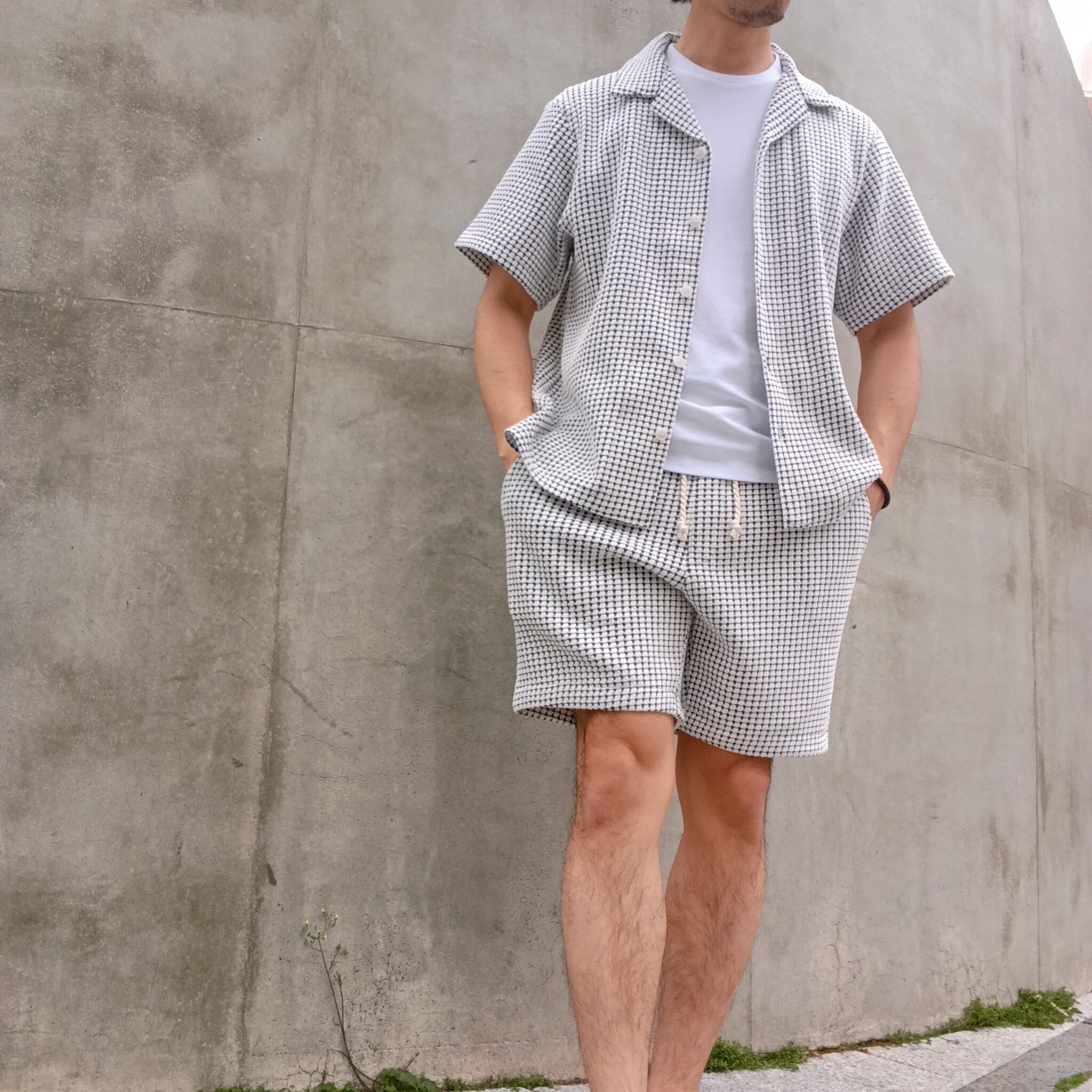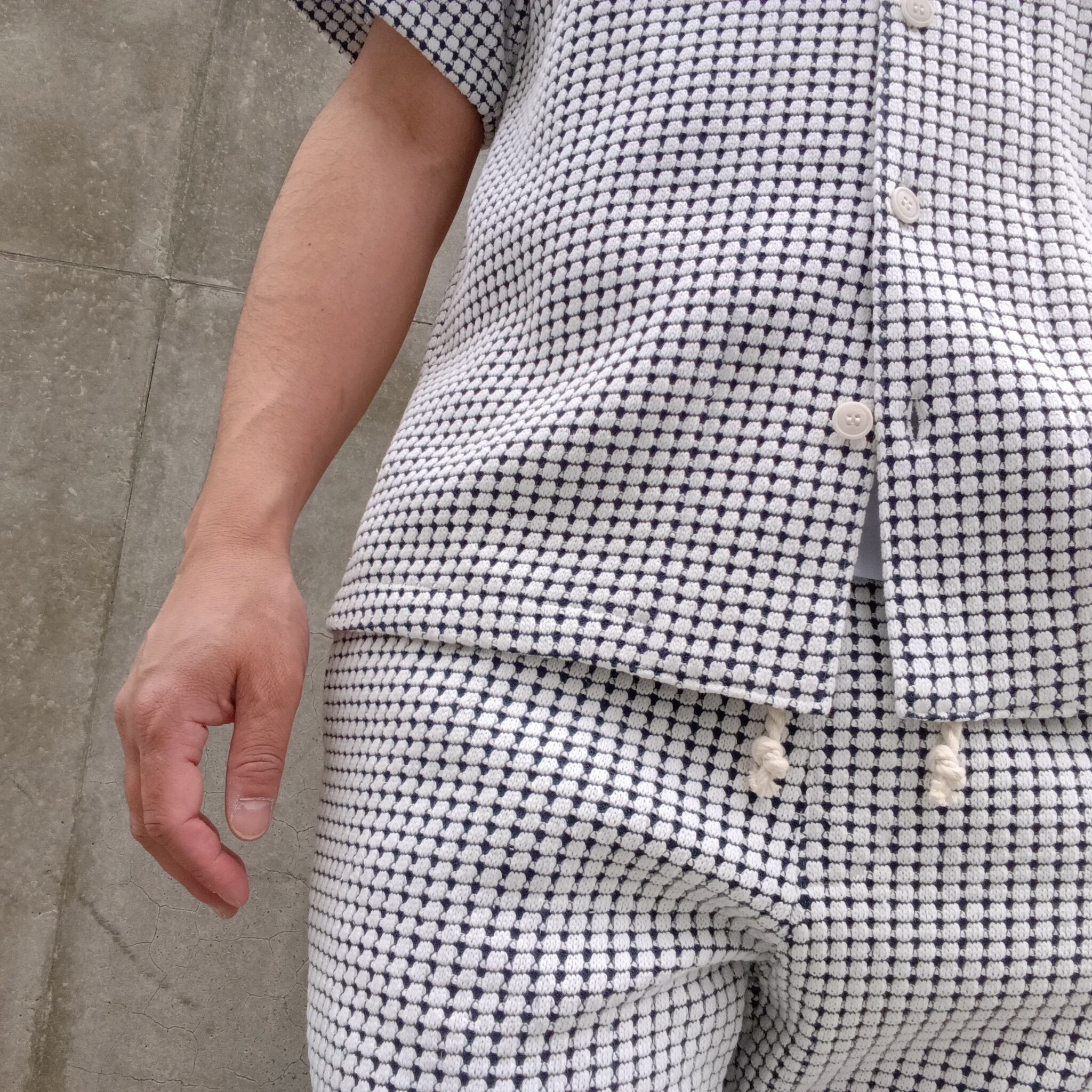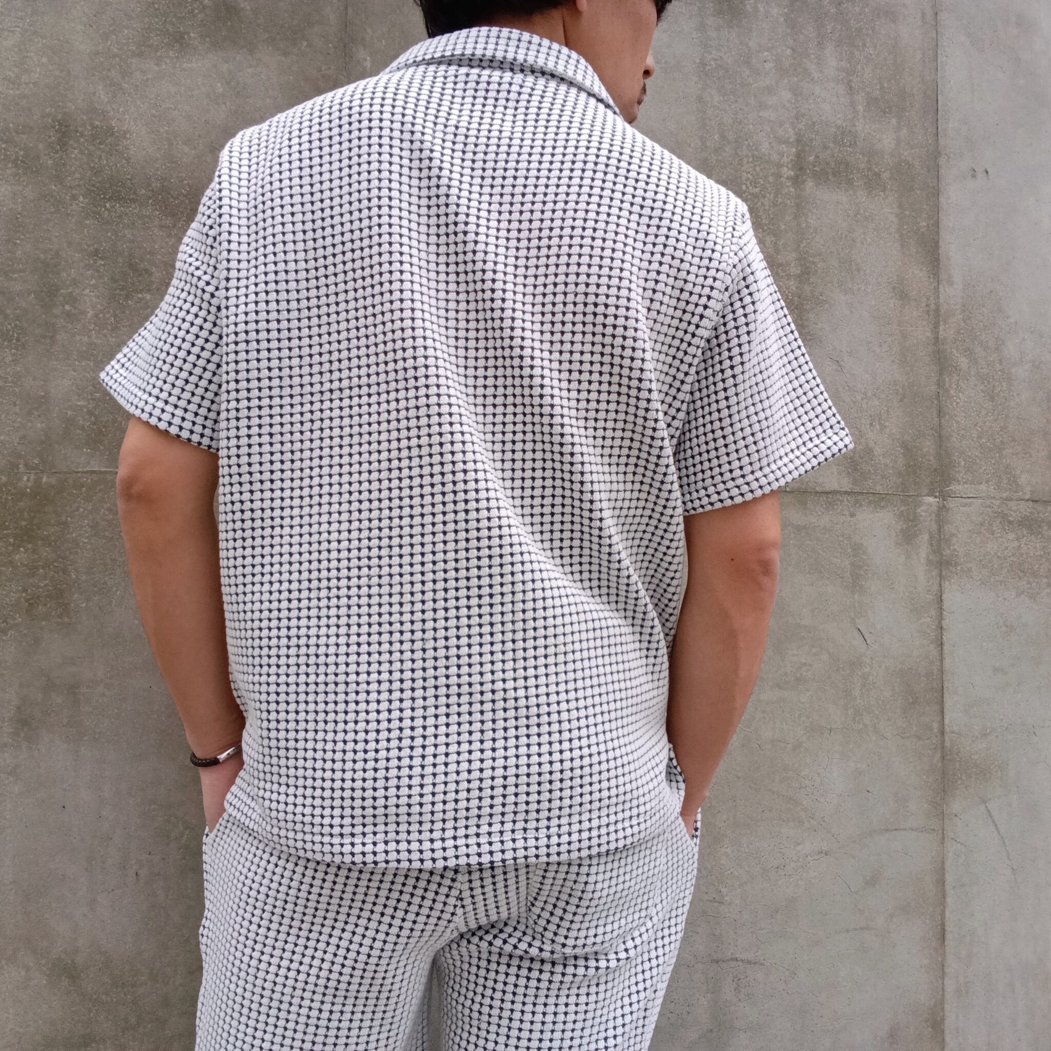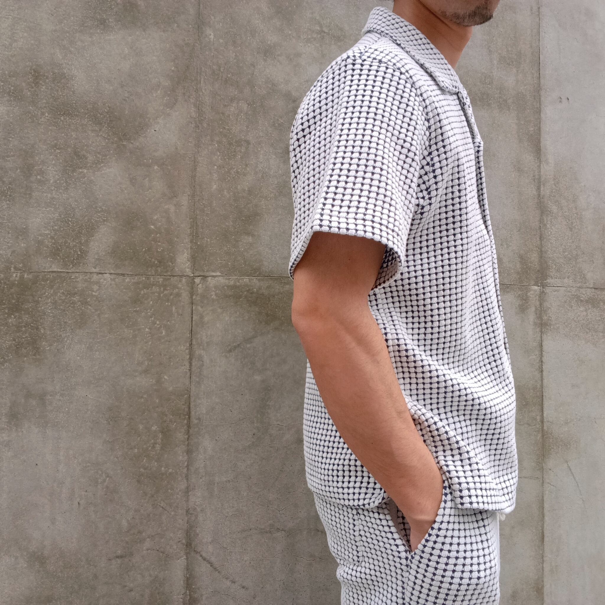 ・表面をコットン、裏面に伸縮性のあるリサイクルポリエステルを使用することで立体的なワッフルの組織感を表現。