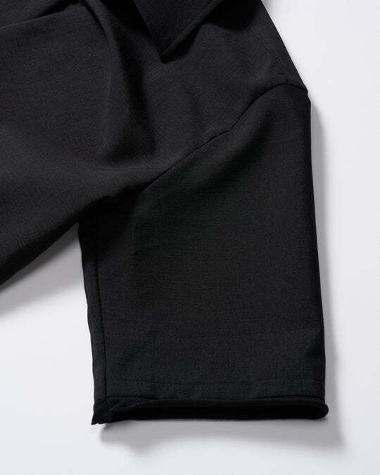 袖口と背接ぎに天竺ロールを施し、wjkらしいデザインアクセントを加えている。サイドに深めのスリットを入れることで機能面も考慮。