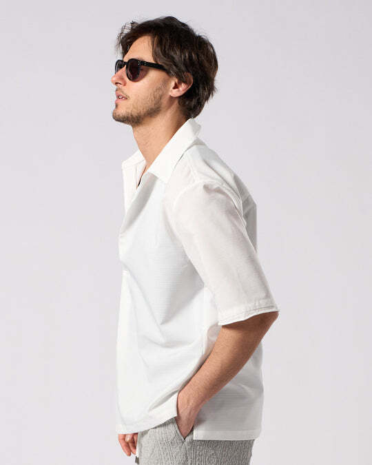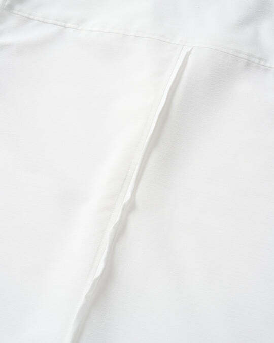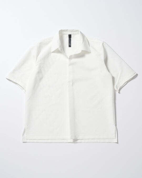 繊細な凹凸によるナチュラルな表情かつ肌離れの良いブッチャー生地を採用。高機能素材「セオアルファ®」を使用しており、吸水速乾に優れ軽量でシワになりにくいため快適に着用でき、かつ上品な風合いをキープしてくれる。