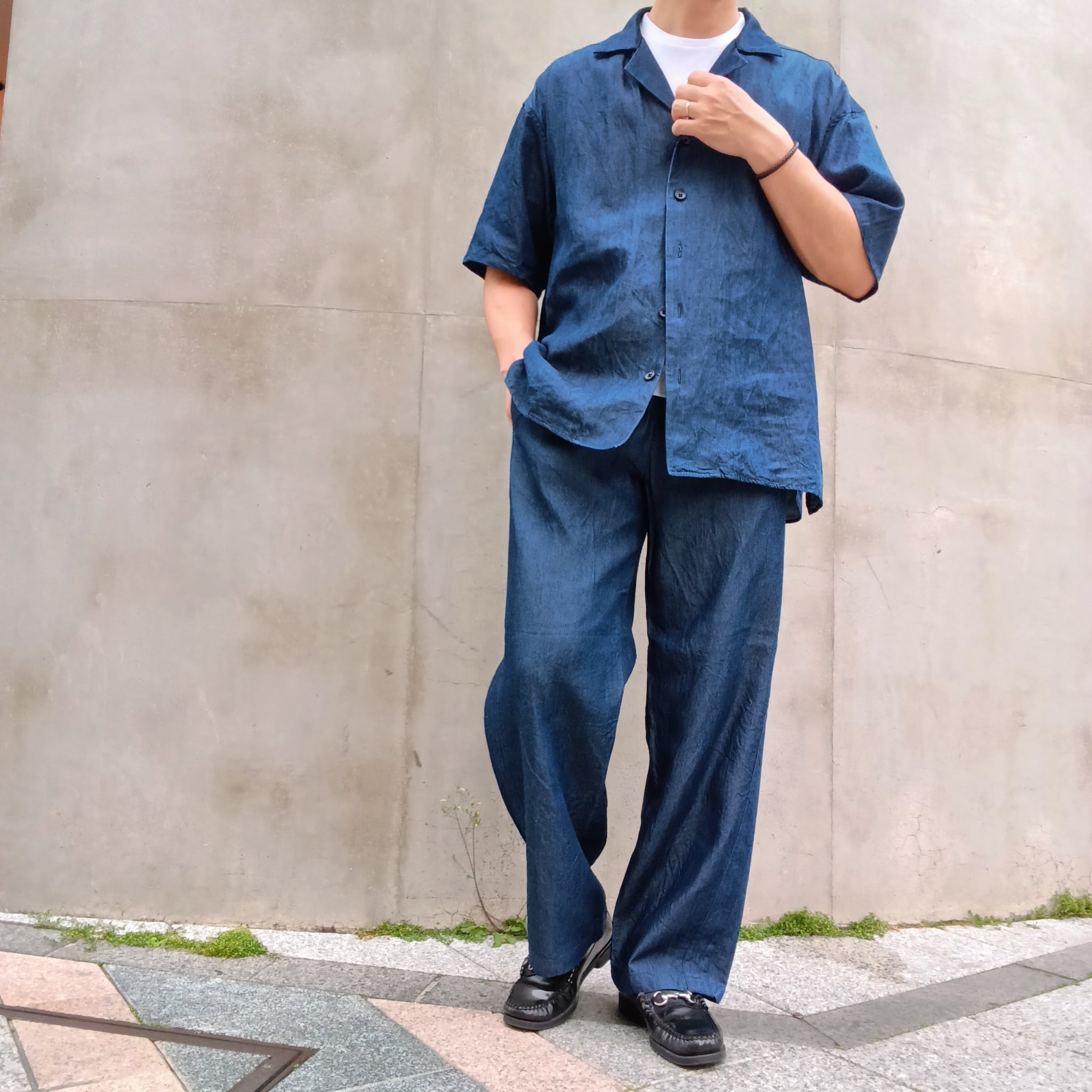 植物由来でサスティナブルなテンセルTMリヨセル繊維を使用した薄手のインディゴデニム素材。しなやかな反発感とドレープが特徴で、インディゴ染料特有のナチュラルなフェード感のある色落ち感が楽しめるアイテム。デザインはサイドスリット入り、フロントスクエアーカット、バックがラウンドカットモデル。オープンカラーを採用し裾は前後で形を変えることでシルエットにメリハリをつけています。大人のリラックス&リゾートスタイルを提案しています。同素材のワイドパンツとのセットアップも大変おすすめです。