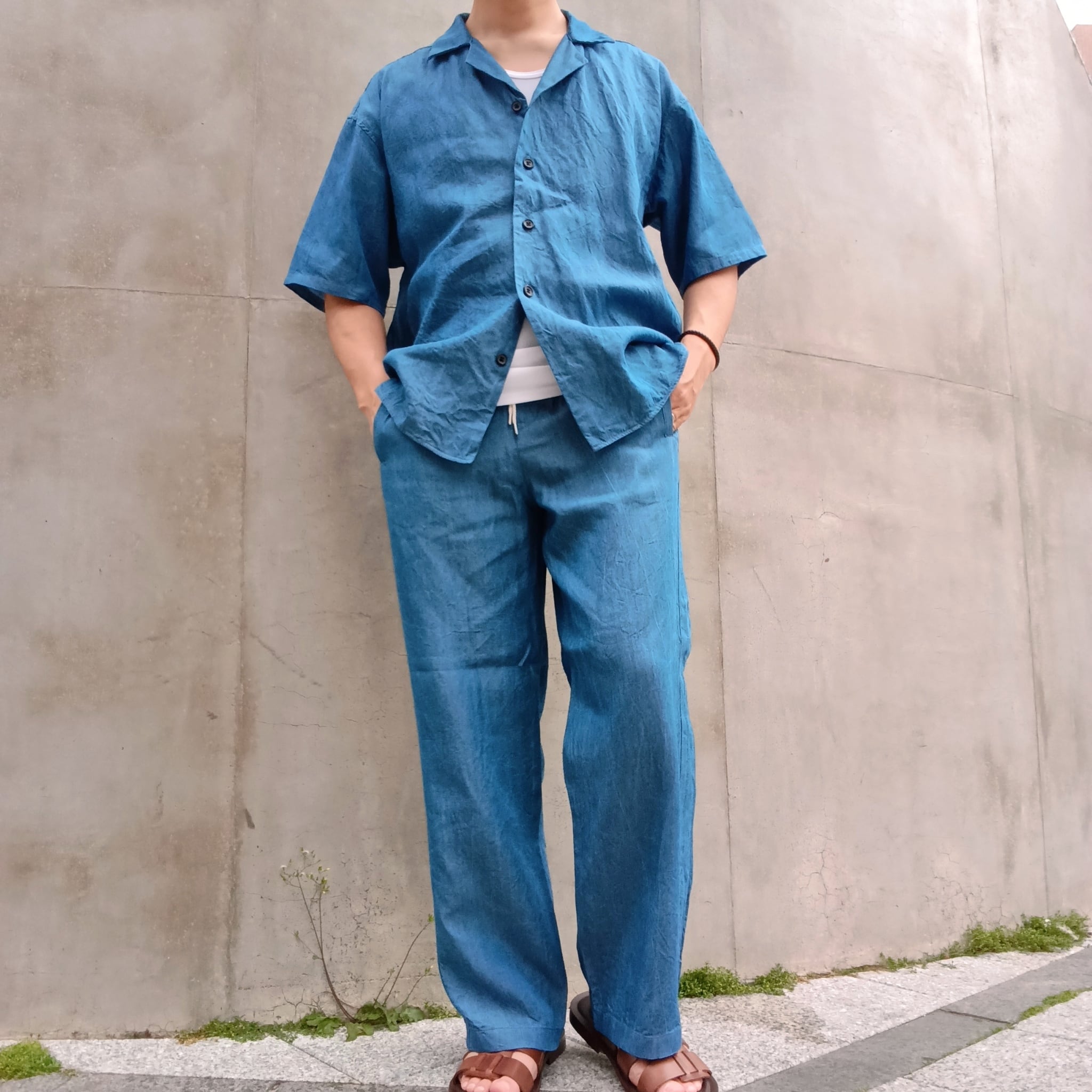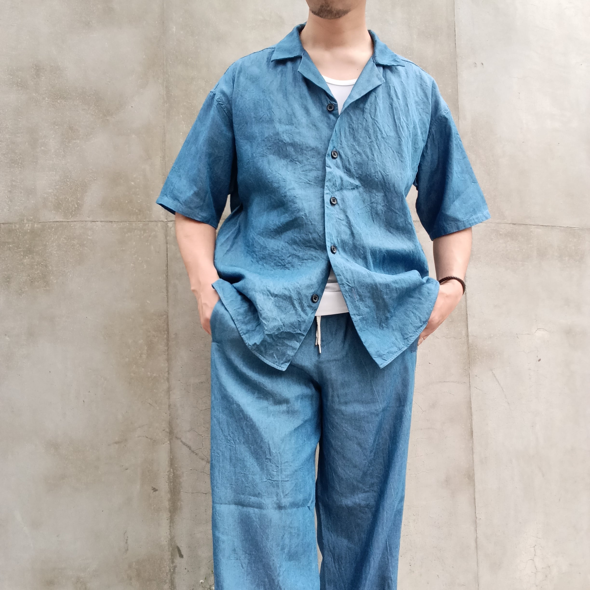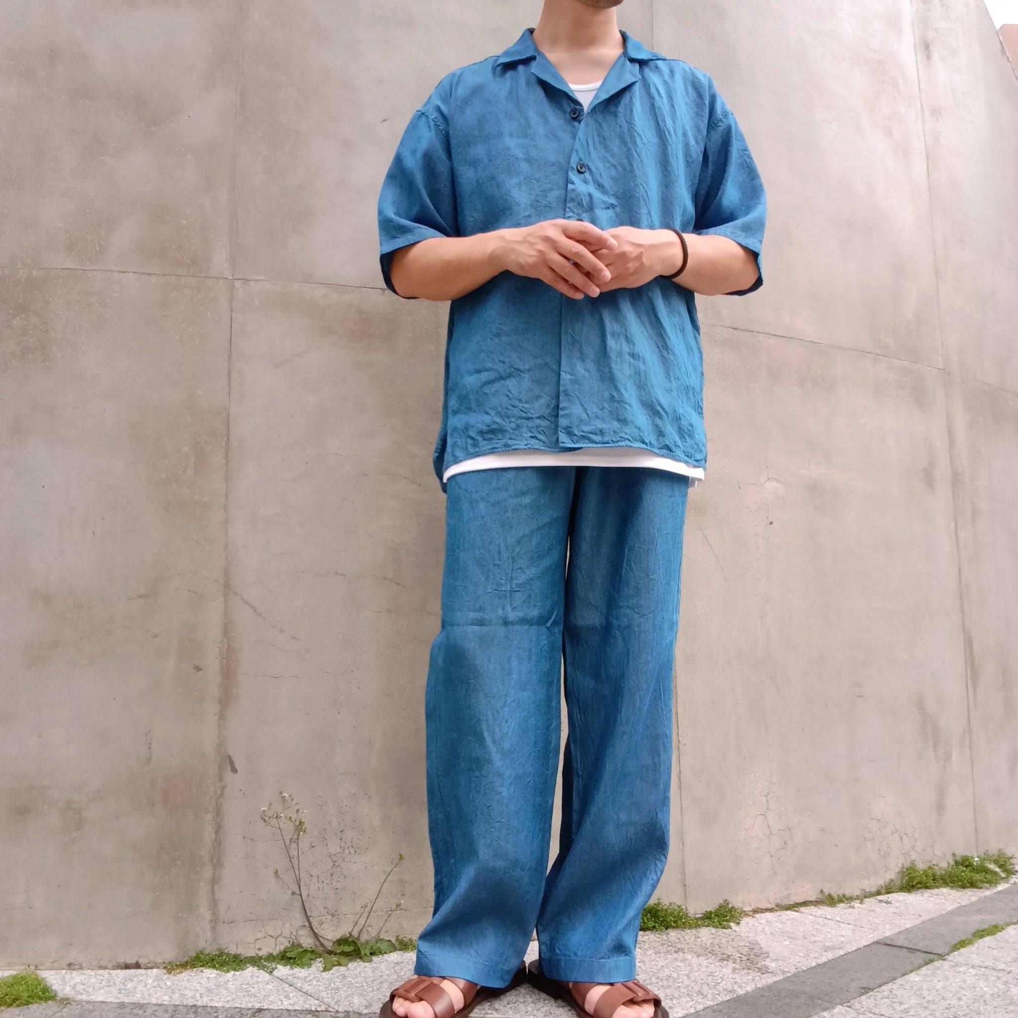 植物由来でサスティナブルなテンセルTMリヨセル繊維を使用した薄手のインディゴデニム素材。しなやかな反発感とドレープが特徴で、インディゴ染料特有のナチュラルなフェード感のある色落ち感が楽しめるアイテム。デザインはサイドスリット入り、フロントスクエアーカット、バックがラウンドカットモデル。オープンカラーを採用し裾は前後で形を変えることでシルエットにメリハリをつけています。大人のリラックス&リゾートスタイルを提案しています。同素材のワイドパンツとのセットアップも大変おすすめです。