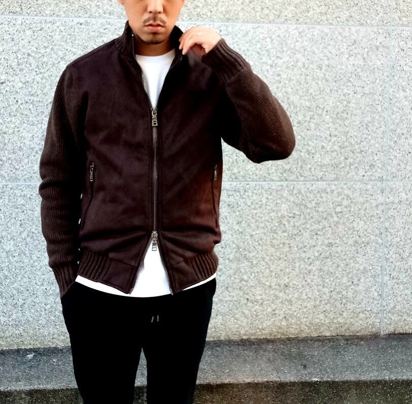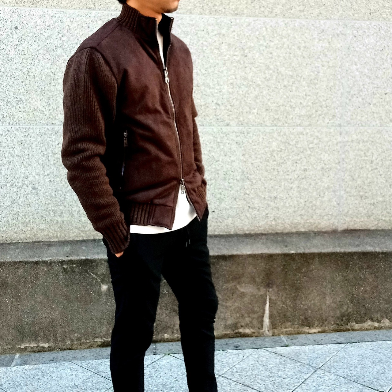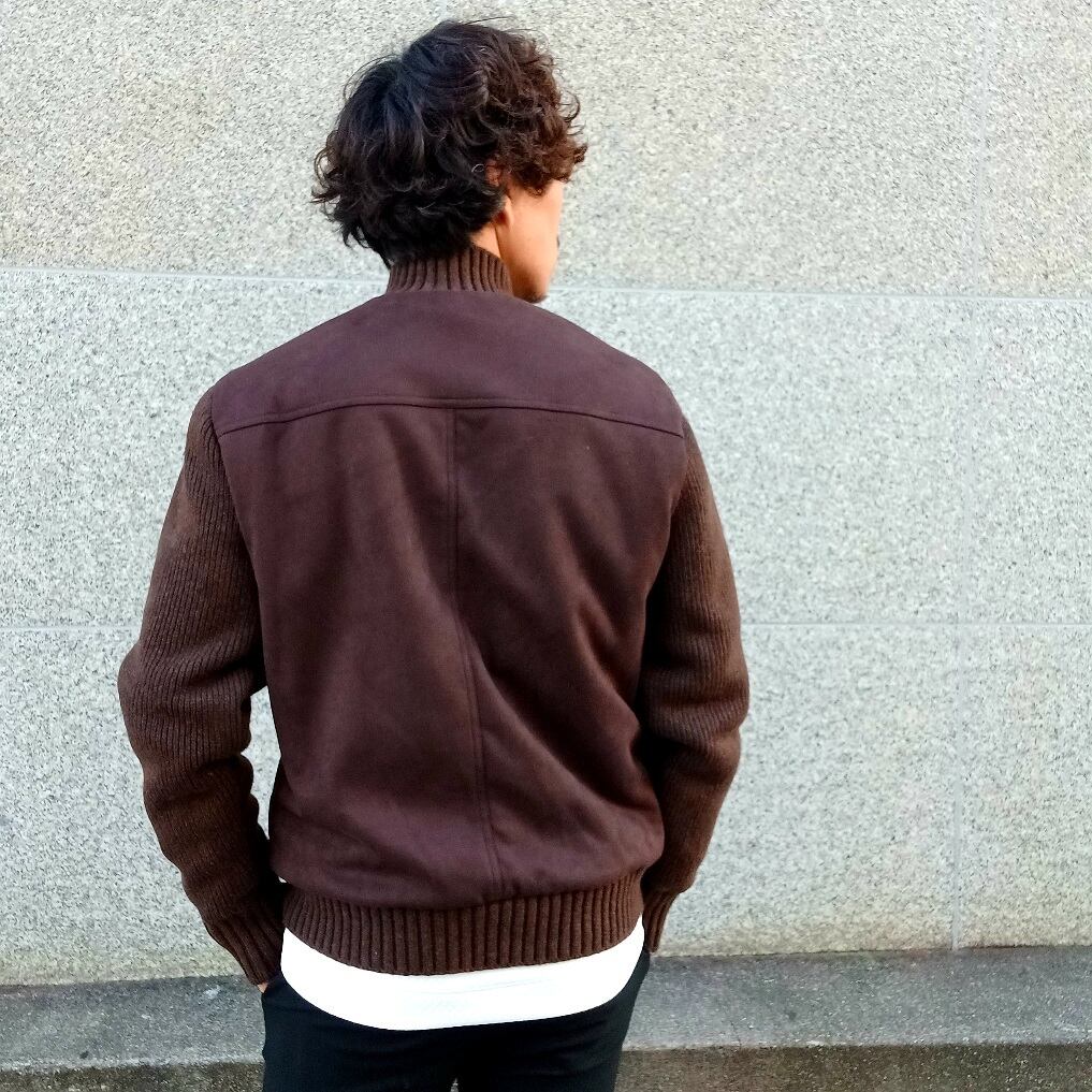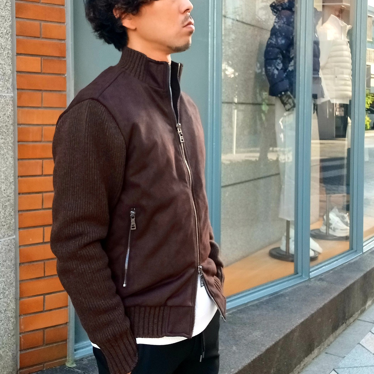 身頃はエコスエード、袖はアクリルニットのコンビネーションジャケット。滑らかなフェイクスエードを使用し微光沢感のある艶やかな見え方で、厚さがありながら、軽く柔らかで保温性も有する特徴を持った生地です。
